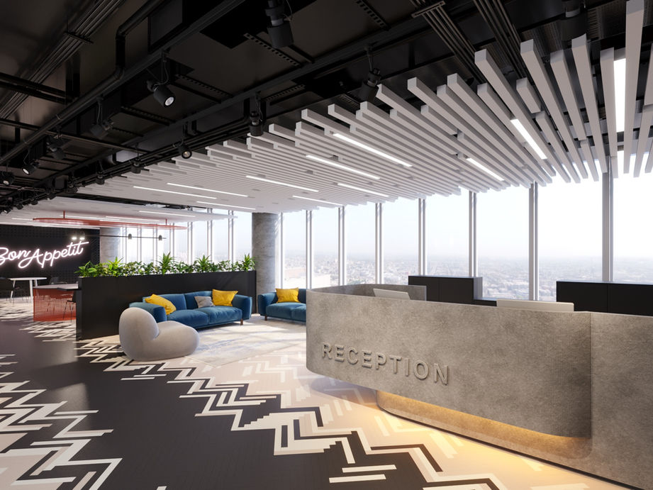 Interior design visualisation. Reception, kitchen and Lounge area at the Playtika co-working space in Herzelia, Israel.
